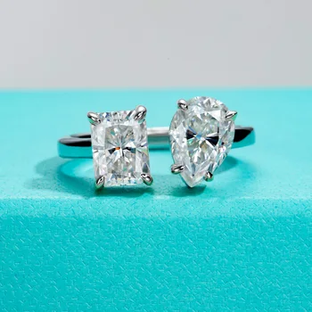 AnuJewel 4cttw D Color Radiant&Pear Cut Moissanite Anti-Stress Ring 925 Sterling Silver Two Stones Engagement Wedding Rings